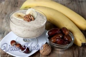 يُصب عصير التمر و الموز مع الحليب في كأس التقديم، ويُزين بقليلٍ من الفواكه الجافة .